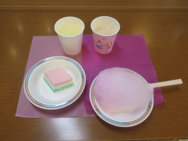 ひなまつりメニューは、菱餅を模った3色ババロア、綿あめ、甘酒、桃のカルピス。