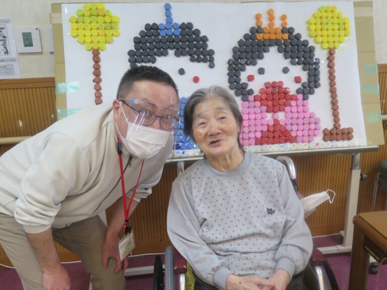 キャップに色紙を巻いてひとつひとつくっつけて描かれているんですよ♪